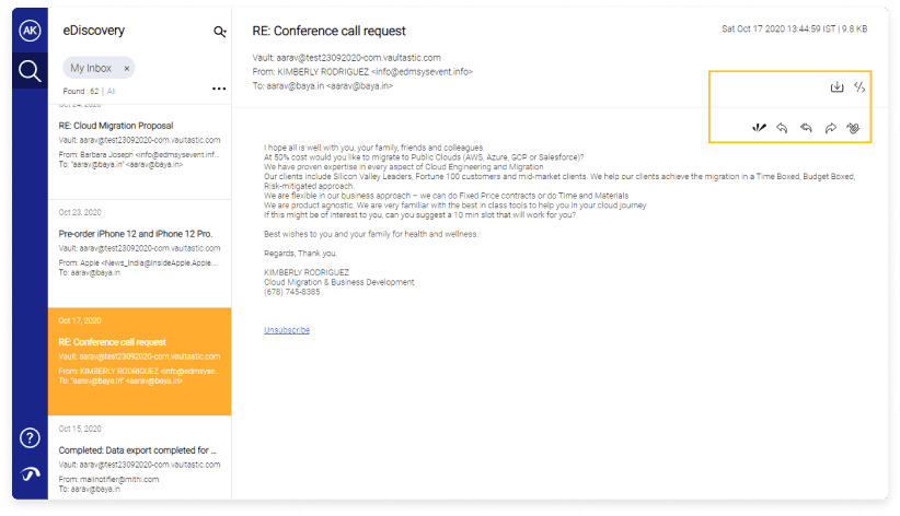 A rich set of cloud and data services support rapid and accurate discovery of email data from this central repository.